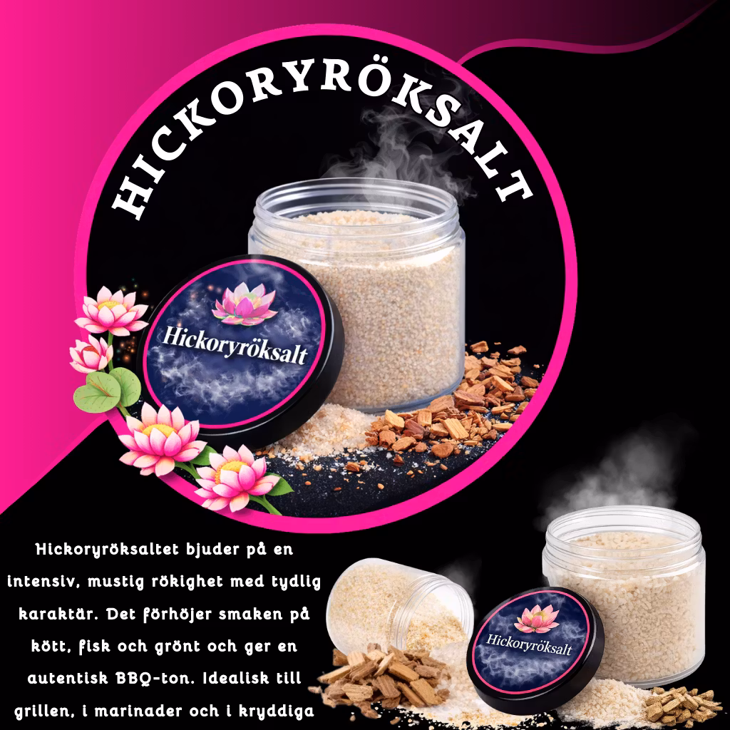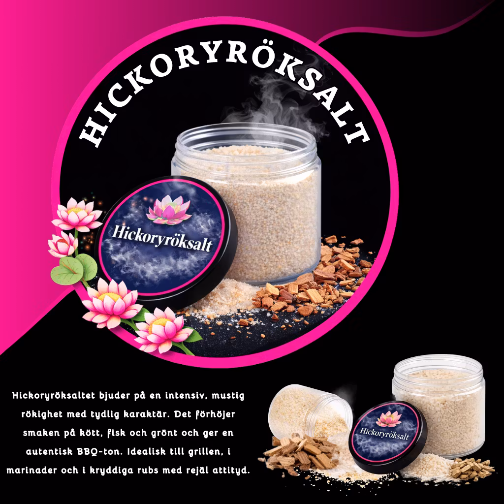 Ett givet inslag i exklusiva rubs och glazer för den som söker en autentisk, lång och nyanserad röksmak. Högt uppskattat av både grillentusiaster och finsmakare. Hickoryröksalt adderar karaktär, djup och elegans till varje rätt.