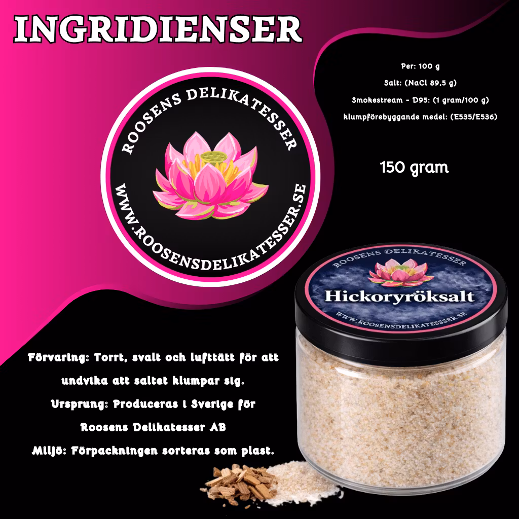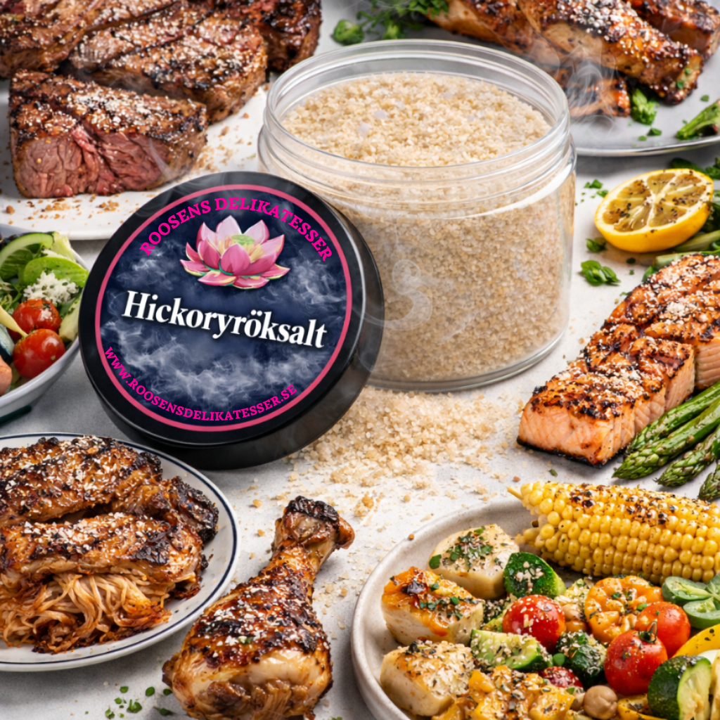 Roosens Delikatesser AB hickoryröksalt ingår i vårt sortiment av smaksatta salter och kännetecknas av sin djup, elegant rökighet där subtil sötma möter en mjukt rundad sälta. Den komplexa, nötiga och aromatiskt intensiva hickorykaraktären omsluter rätten med en sofistikerad doft och en lång, fyllig eftersmak med en smakupplevelse skapad för finsmakare.