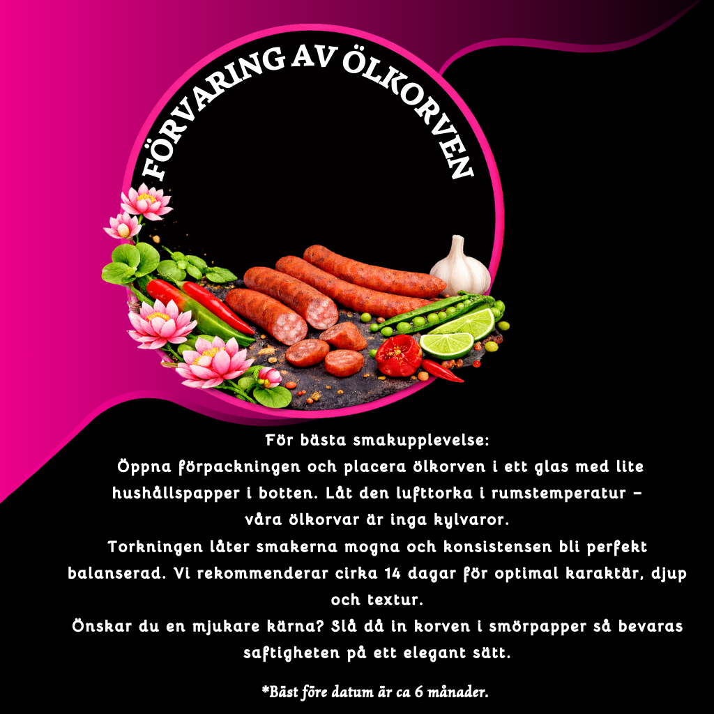 Våra ölkorvar behöver ingen kylförvaring, vilket gör dem perfekta att ta med på utflykter, promenader eller andra äventyr.