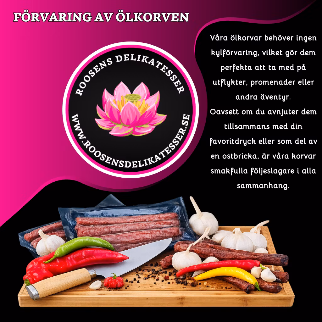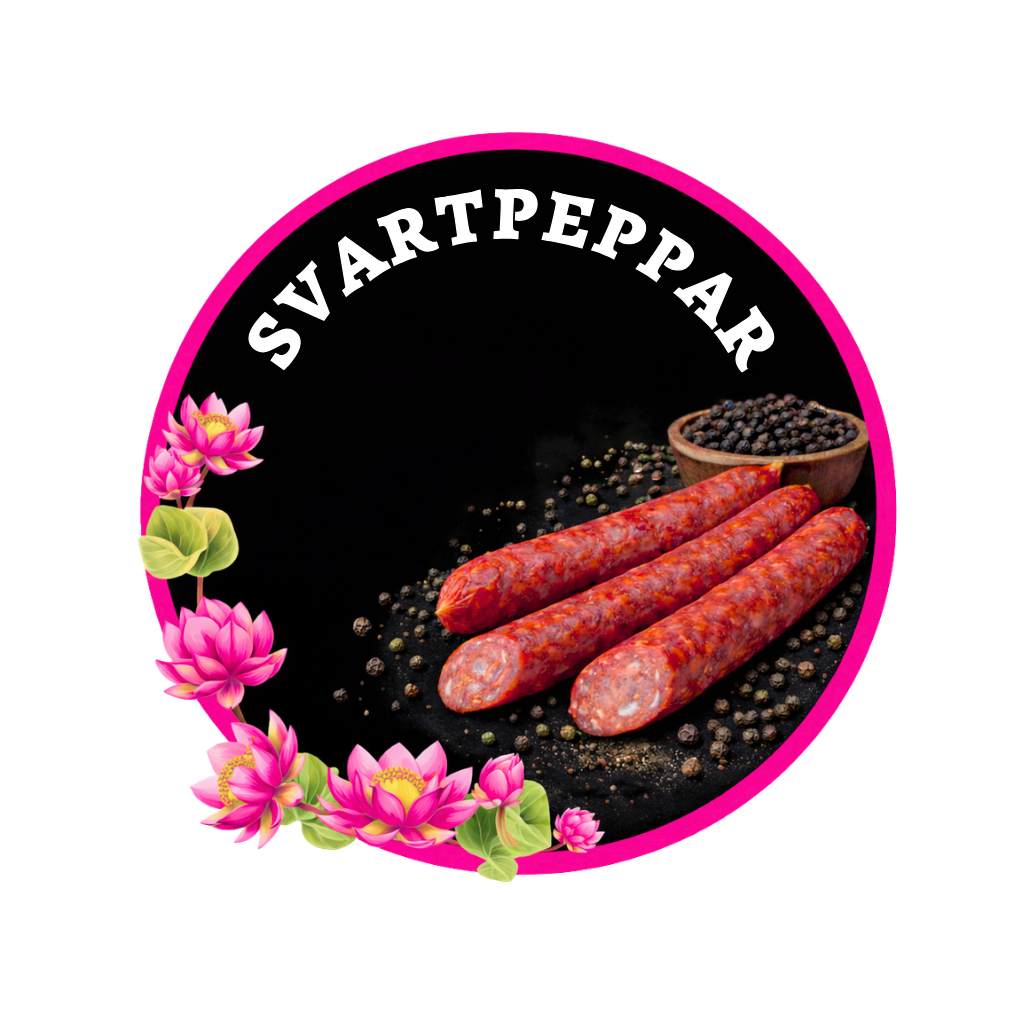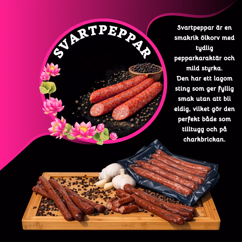 Svartpeppar är en smakrik ölkorv med tydlig pepparkaraktär och mild styrka. Den har ett lagom sting som ger fyllig smak utan att bli eldig, vilket gör den perfekt både som tilltugg och på charkbrickan.