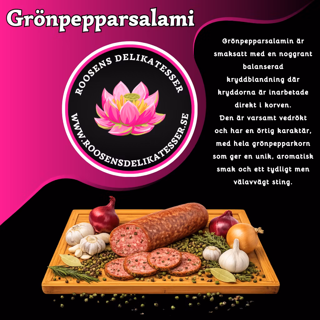 Roosens Delikatessers vedrökta salami kommer i två olika smaker, grönpepparsalami och vitlökssalami och kommer förpackade med en salami på 180 g per förpackning.
