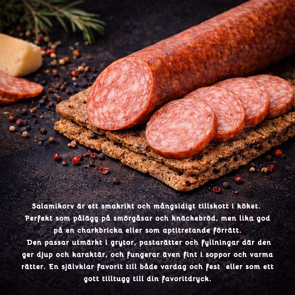 Salamin passar utmärkt till smörgåsbordet som smörgåspålägg på ett grovt rågbröd eller ett gott knäckebröd. Salamikorven kan även serveras som förrätt och är en bra ingrediens i grytor, fyllningar, pastarätter och till soppor. Eller som ett gott tilltugg till din favoritdryck, ostbricka eller liknade.